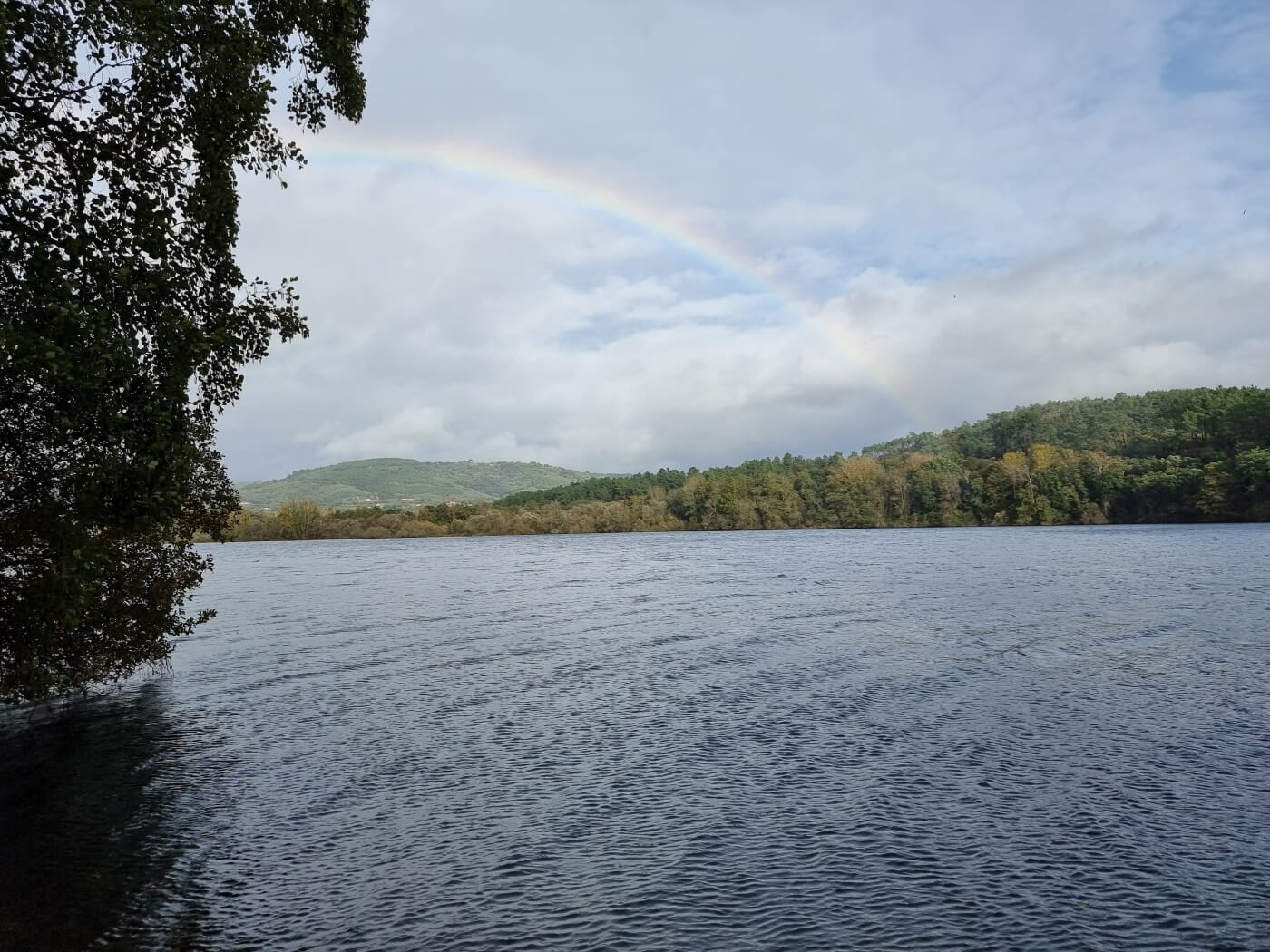 Als es hell wird, stehen wir im Nebel bei 8°C. Wir gehen es langsam an und warten bis die Sonne durchkommt. Dann gehen wir zunächst zur ca. 200 Meter entfernten Hängebrücke über den Rio Ulla. Die Hängebrücke ist eine der längsten Hängebrücken Galiciens. Die Hängebrücke wurde 1964 für den Diktatur Franco gebaut, damit dieser nach Xirimbao gelangen konnte, um dort Lachse zu angeln, die im Fluss Ulla zahlreich vorhanden waren. Anschließend gehen wir auf dem Wanderweg entlang des Rio Ulla zur Ponte de Pontevea. Es ist mehr ein schmaler Pfad als ein Wanderweg, aber gut zu gehen und sehr idyllisch. Die Brücke in Pontevea ist eine der ältesten römischen Brücken in Galicien. Immerhin bekommen wir in Pontevea in einem gewöhnungsbedürftigen Laden frisches Baguette und gehen dann auf demselben Weg zurück zum Alpa, der immer noch ganz alleine steht.