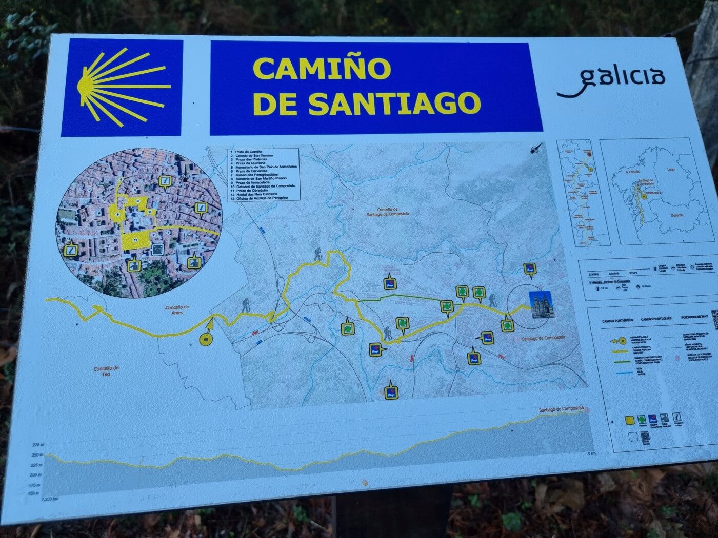 Ein paar Kilomteter vor Santiago de Compostela bekommen wir einen schönen Platz auf dem Stellplatz in O Milladoiro. Erst hier stellen wir fest, wie nah wir eigentlich schon an Santiago sind. Und als wir dann noch zufällig den Wegweiser des Jakobsweges sehen, beschließen wir, morgen nach Santiago zu gehen…äh…pilgern. Und obwohl der Parkplatz recht zentral liegt, wird es am Abend sehr ruhig hier.