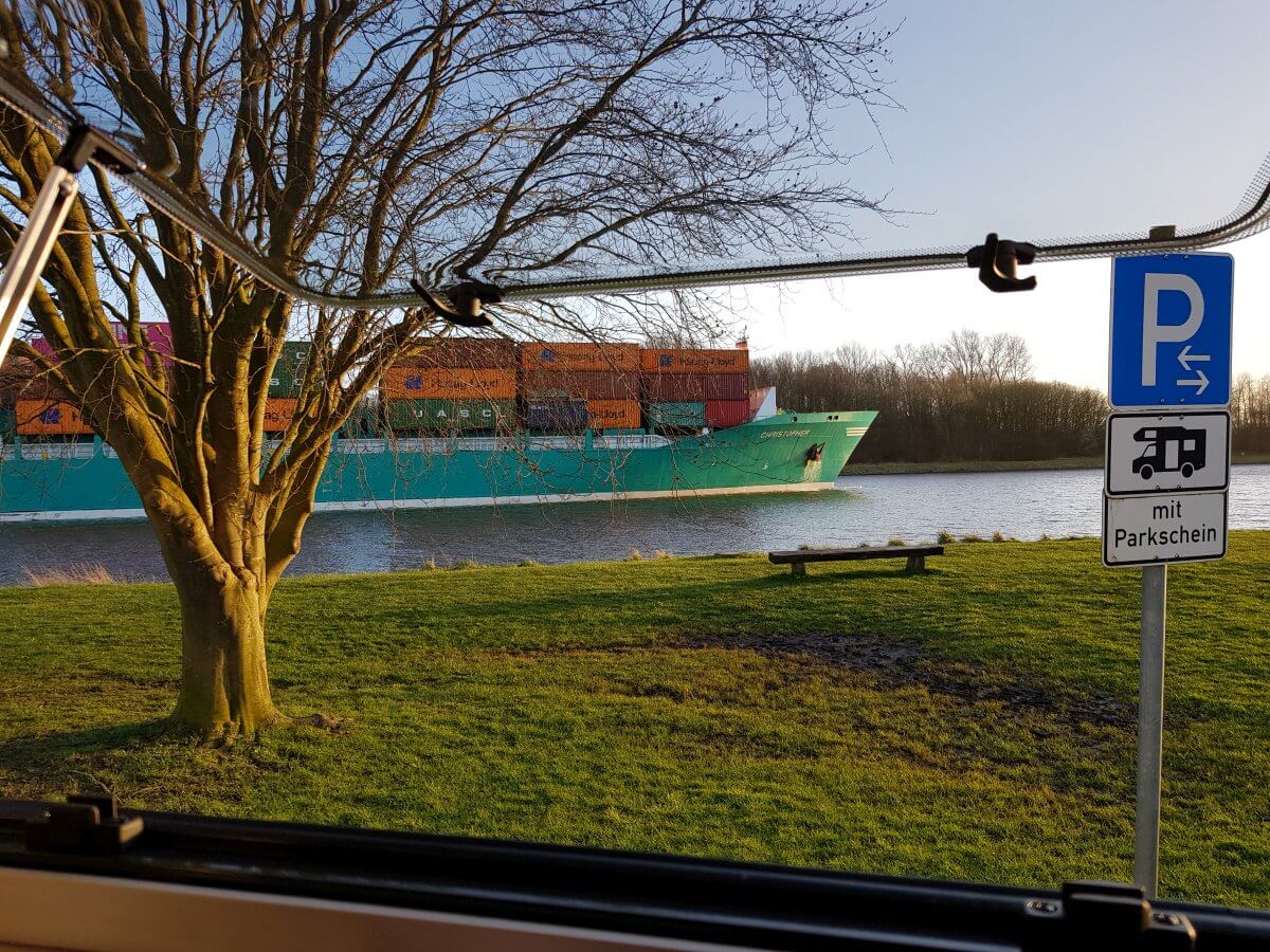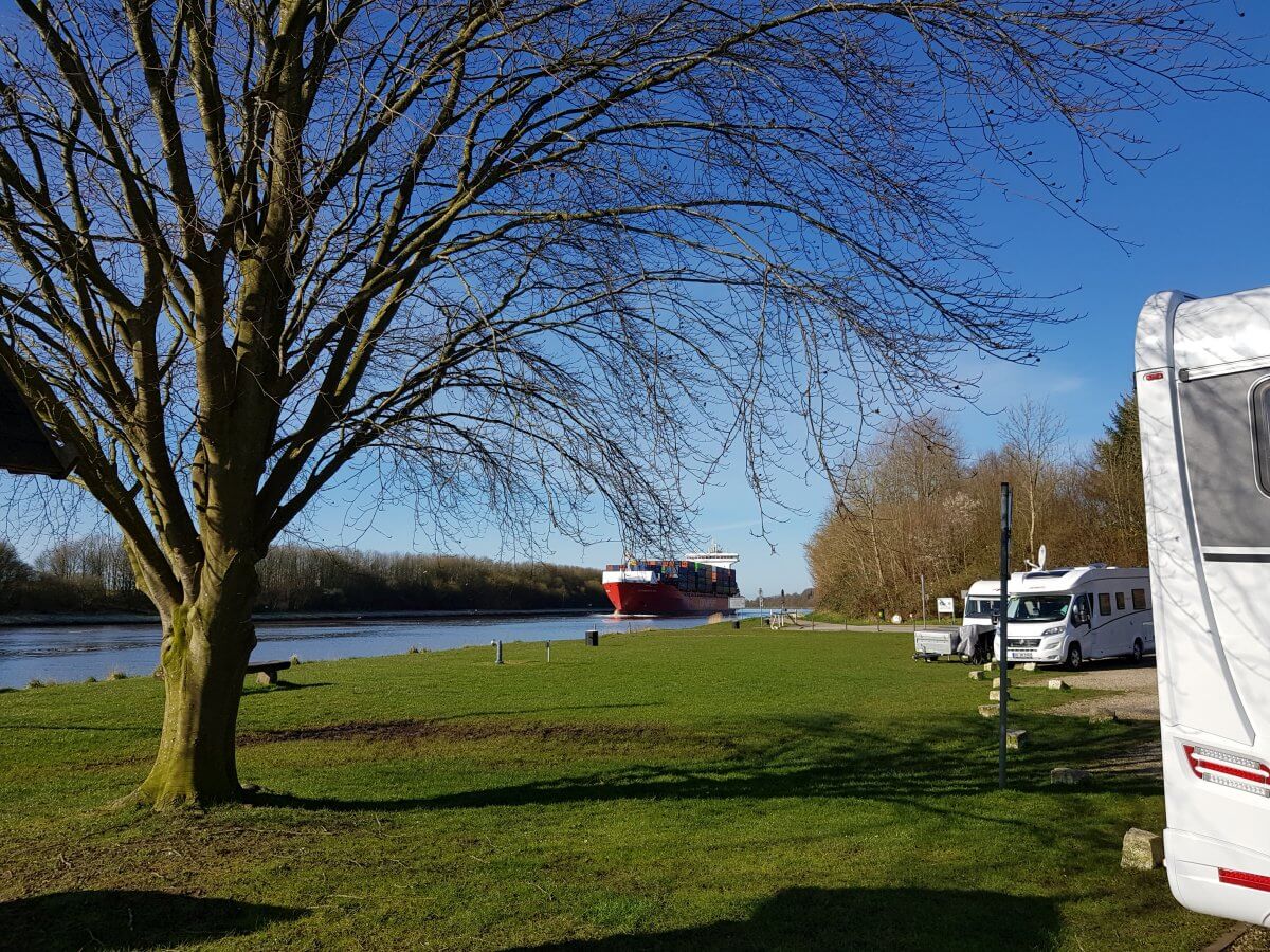Nachdem wir zwei Tage in Kiel verbracht haben, wollen wir das tolle Wetter noch ausnutzen und fahren an den Nord-Ostsee-Kanal. Hier gibt es diverse Wohnmobilstellplätze und fast alle mit direktem Blick auf die vorbeifahrenden dicken Pötte.