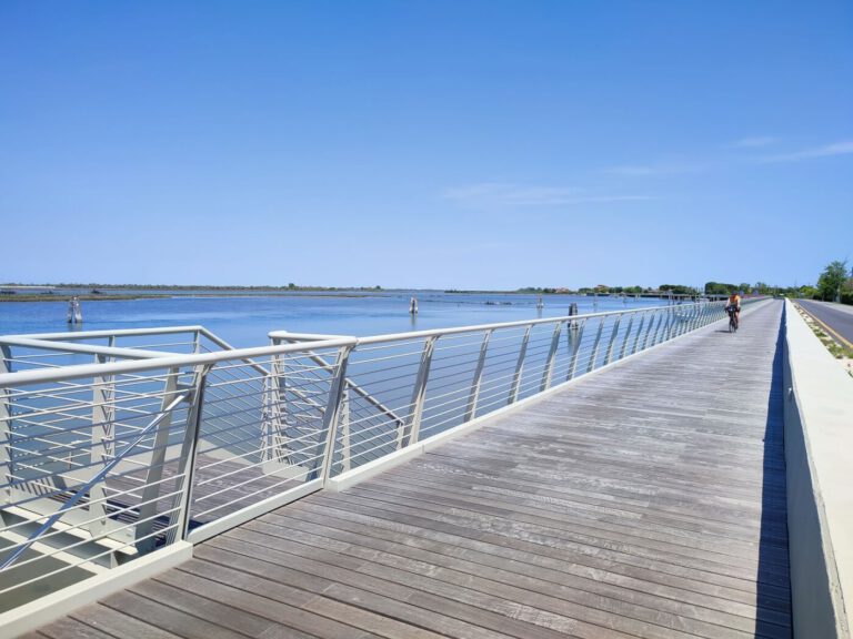 Wir bleiben insgesamt fünf Nächte auf dem 5*-Campingplatz. Das Wetter ist wunderschön, der Strand nicht überfüllt und das Wasser angenehm warm. Wir verbringen die Zeit unter anderem mit unseren SUPs und einer Radtour nach Lio Piccolo, wobei wir auch einen Teil des nagelneuen Radweges entlang der Lagune nach Cavallino befahren.