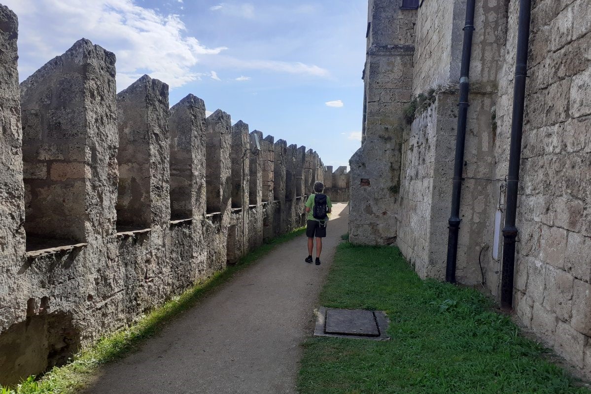 Wir machen einen kurzen Abstecher zu den Outlets in Piding, bevor wir nach Burghausen fahren. Hier erwartet uns die weltlängste Burg, die mehr als einen Kilometer lang – genau 1051 Meter – über der denkmalgeschützten Altstadt thront (ausführliche Informationen zur Burg findet man u.a. hier). Unsere Bedenken, dass wir auf dem Stellplatz keinen Platz kriegen, werden zum Glück schnell zerschlagen: es steht nur ein einziges Wohnmobil auf dem großen und sehr großzügigen Platz. Herrlich! Nach einem verspäteten Frühstück gucken wir uns den Ort und die Burg an. Es ist wirklich sehenswert und wir überlegen, länger hier zu bleiben, um noch ein wenig zu radeln. Die nächsten Tage soll es wieder über 35°C warm werden und die Lebensmittel in unserem defekten Kühlschrank würden es uns danken, wenn wir den Wagen nicht viel bewegen.