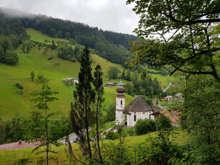 Obwohl das Wetter am Morgen nicht so dolle aussieht, fahren wir mit dem Motorrad die 10 Kilometer zum Parkplatz neben der Kirche in Maria Gern (als Norddeutscher ist man ja einiges gewöhnt). Von hier aus führt „eine leichte Wanderung auf den Berchtesgadener Hausberg…auf den 1.188m hohen Gipfel…mit herrlicher Aussicht auf den Ort und den Watzmann“ (so der Prospekt). Wir wollen vor allem hier rauf, weil wir glauben, das Gipfelkreuz vom Stellplatz aus sehen zu können. Als wir ankommen ist zu unserer Freude der Parkplatz leer. Allerdings kommt just in diesem Moment ein Linienbus an und Unmengen an Menschen steigen aus! Wir wandern schnell los, in der Hoffnung, dass diese vielen Menschen nicht dasselbe Ziel haben wie wir. Der Weg ist super ausgebaut, das Ziel kann man nicht verfehlen, es gibt sogar verschiedene Wege hoch. Auch wenn der Weg als einfach angegeben ist, kommt man doch ins Schwitzen, denn steil ist es trotzdem. Unterwegs begegnen wir schon diversen anderen Wanderern und sind froh, so früh losgegangen zu sein. Als wir an der Paulshütte vorbei oben am Aussichtspunkt „Salzburgblick“ ankommen, entpuppt sich das Gipfelkreuz, welches wir gesehen haben, als Sendemast…und von Salzburg kann man nichts sehen, da es im Nebel liegt. Zu guter Letzt fängt es auch noch an zu regnen, so dass Berchtesgaden und der Watzmann auch nur noch zu erahnen sind. Also geht’s wieder runter, durch die Menschenmassen, die jetzt nach oben strömen.
