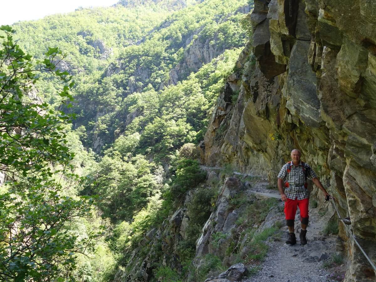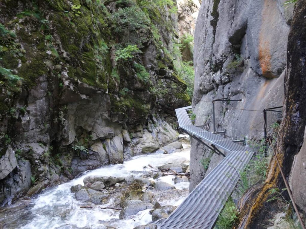 Sobald man die Unterführung des „Petit train Jaune“ passiert hat, steht man in der Schlucht. Felsen auf der einen Seite, ein reißender Fluss auf der anderen Seite. Wir sind den Weg im Uhrzeigersinn in Richtung Roc de la Madrieu gegangen und hatten bei einem etwas steileren Anstieg bald tolle Ausblicke in die Schlucht und auf den in den Fels gehauenen Weg, der unser Rückweg sein wird. Bis wir allerdings dort sind, geht es über Leitern, Brücken und gesicherte Pfade immer weiter am Fluss entlang.