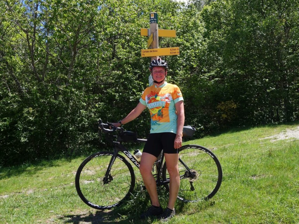 Eigentlich ist so ein enger Stellplatz gar nicht unser Ding, aber die Landschaft und das Wetter sind so toll, dass wir unsere Fahrräder nehmen und hinauf zum Col de Jou radeln. Die extrem schmale Teerstraße schlängelt sich den Berg hoch und wir sind froh, dass kein Auto kommt. Das hätte nicht gepasst und eine Randbegrenzung kennt man hier sowieso nicht. Die Straße ist unendlich steil und die Sonne brennt unbarmherzig vom Himmel, aber irgendwann haben wir es geschafft und kommen am Col an (1.125m). Eigentlich suchen wir Wanderwegweiser, aber was finden wir? Ein Parkplatzschild für Wohnmobile! Wie sollen die hier hochkommen?? Einfach unglaublich! Nun gut, wir machen eine kleine Pause und fahren dann auf der für Wohnmobile gesperrten Strecke hinab. Wobei „fahren“ etwas übertrieben ist, denn der Zustand der Schotterpiste ist so schlecht, dass wir die Fahrräder teilweise über die Felsbrocken tragen müssen.